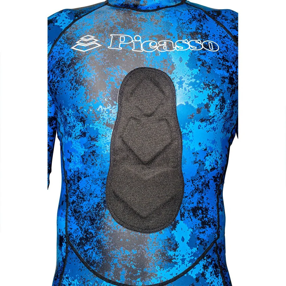 New Picasso camouflage rashguard in blue tones.Top quality super stretchy and thick Lycra.New ultra-ergonomic cut.Supratex ( anti-cut fabric ) reinforced knees.Long padded chest protection for gun charging.One piece full suit without hood and back zipper.